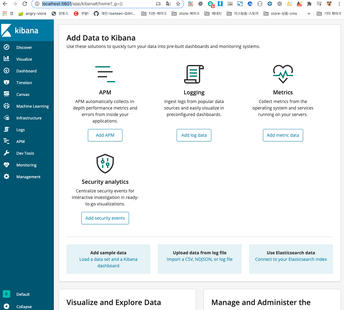 1번 2번을 순서대로 서비스 구동시킨뒤 아래 정보를 브라우저에 입력하면 정상적으로 Kibana 모니터링 도구를 확인할수 있습니다.