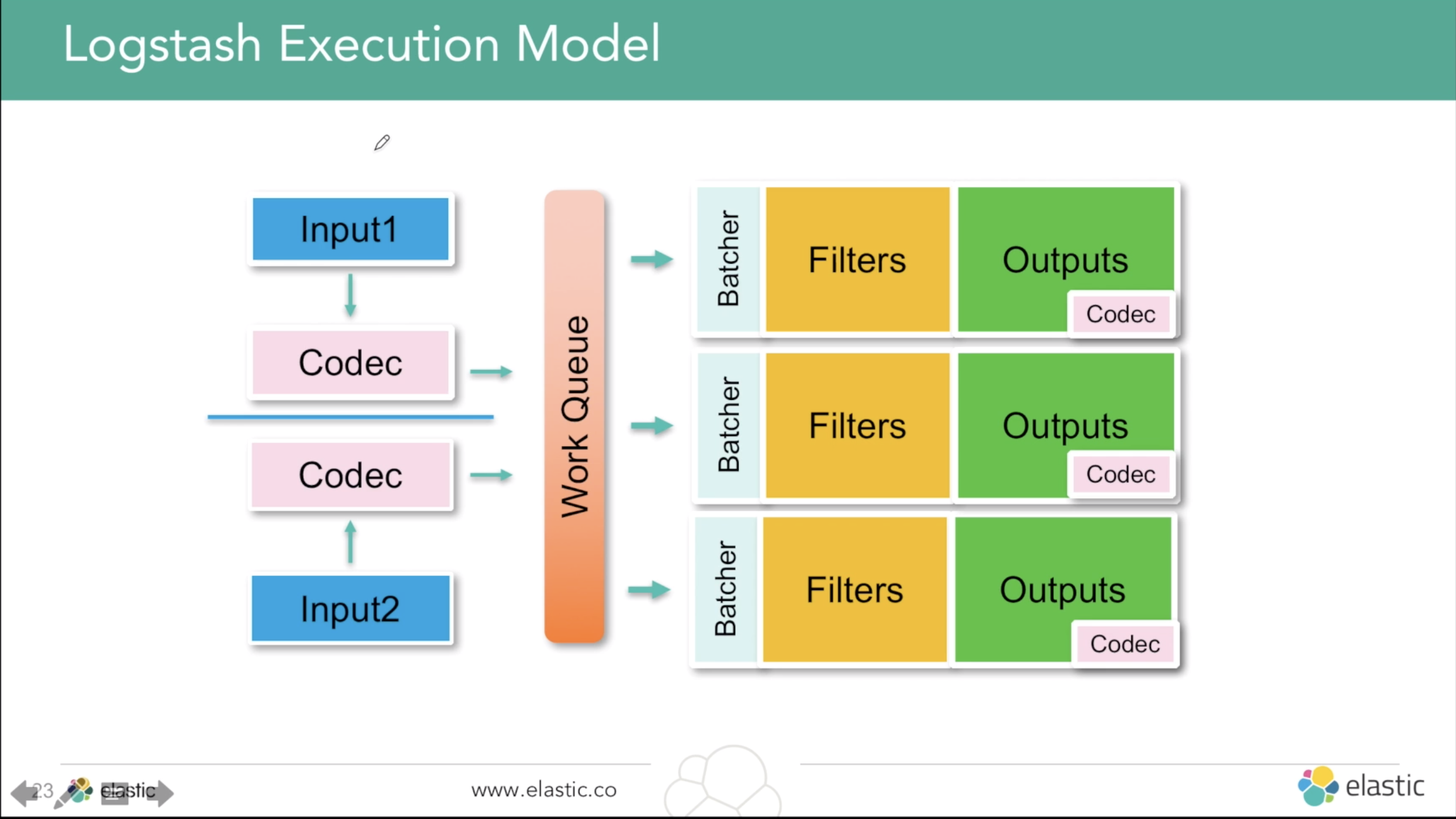 프로세싱은 하나 이상의 파이프라인으로 구성됩니다. 각 파이프라인에서 하나 이상의 입력 플러그인이 내부 대기열에 배치된 데이터를 수신하거나 수집합니다. 이것은 기본적으로 작고 메모리에 보관되지만 안정성과 복원력을 향상시키도록 디스크에서 더 크고 영구적으로 구성할 수 있습니다.