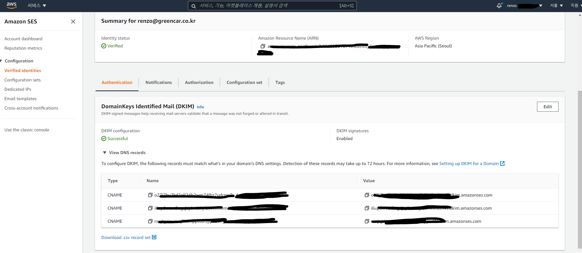 아래 value는 테스트로 넣은정보이기 때문에 Aws ses에서 참고하여 넣어주시기 바랍니다.