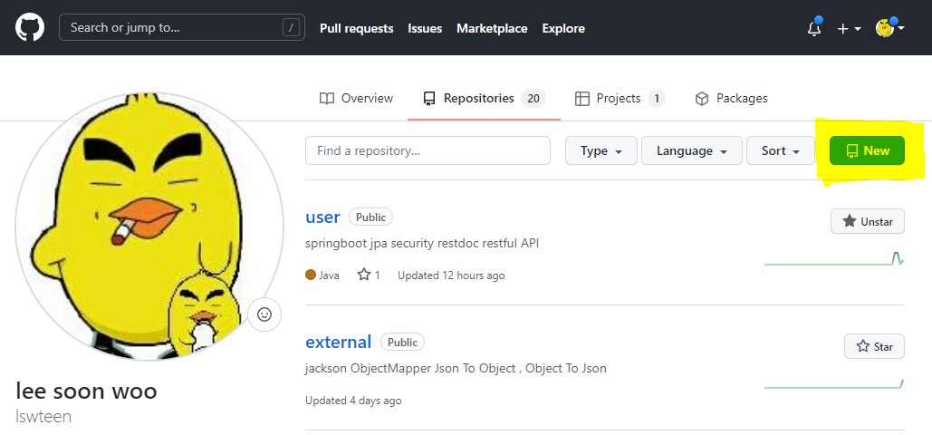 1. github 에 접속후 Repogitoey하나 생성합니다.