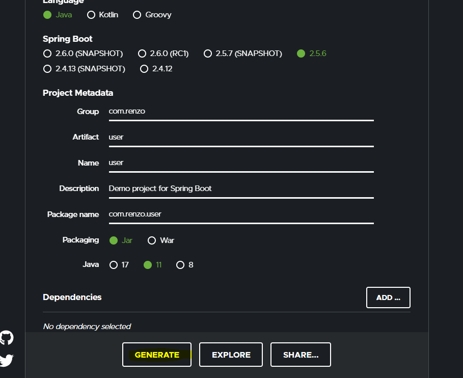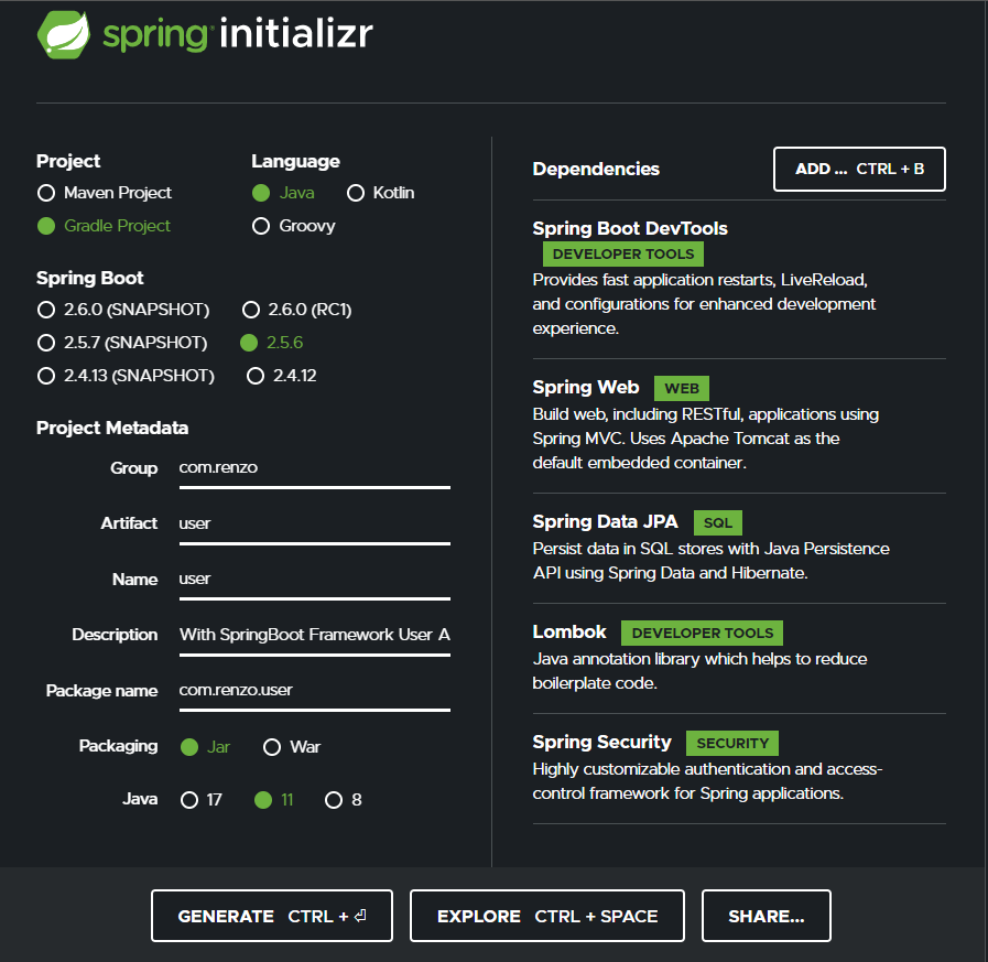 2. https://start.spring.io 접속후 만들려는 스켈레톤 기본 패키지와 Springboot와 함께 사용가능한 플러그인들을 Dependencies 해주시면됩니다.