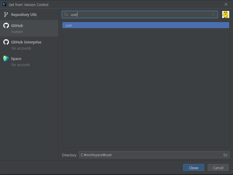 해당 메뉴 클릭하면 아래 이미지처럼 창이 뜨고 github Repogitory 중 작업할 프로젝트를 선택하시면됩니다.