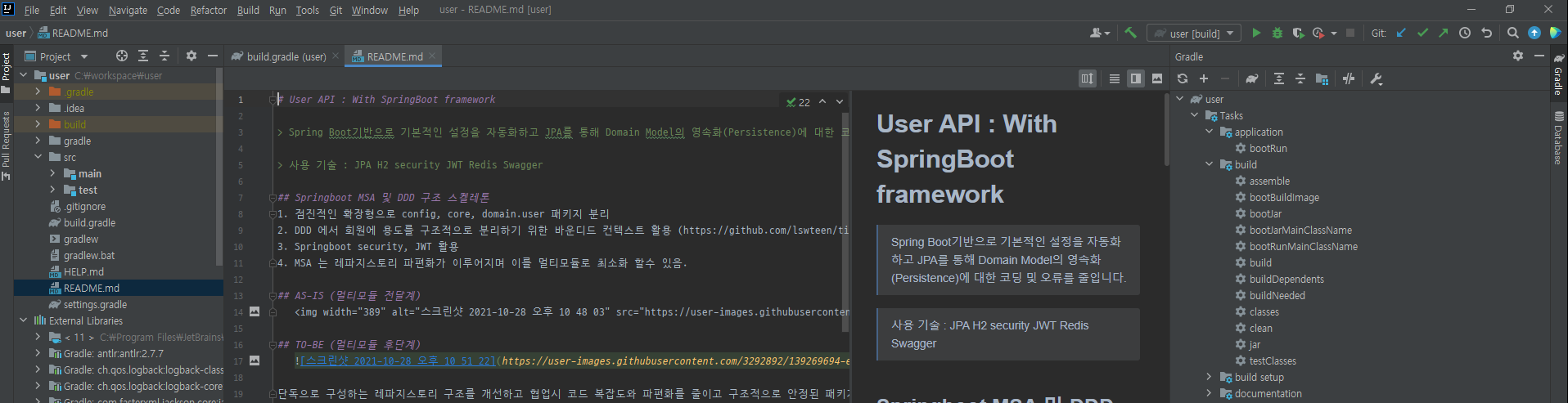 아래처럼 오른쪽 끝에 Gradle 형태로 Intellij 에 load가 되지 않는 다면 해당 프로그램 재시작 하는 방법이 있습니다.