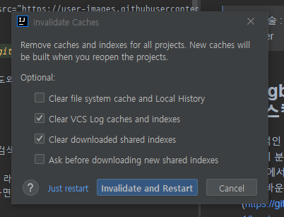 그래도 안되신다면 File > Invalidate Caches 선택하신후 아래 이미지에 "Invalidate And Restart"클릭 하시면 intellij 초기화 되면서 리스타트 됩니다.