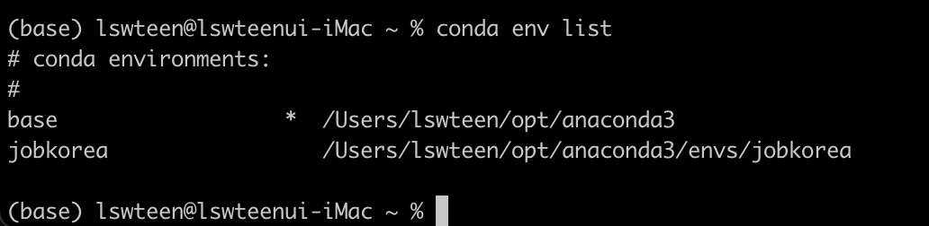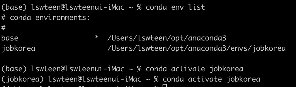 >conda activate jobkrea //해당 명령어 실행시 (base) 가 (jobkorea) 가상환경이름으로 변경된다.