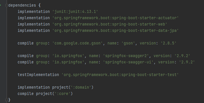 dependencies { compileOnly 'org.projectlombok:lombok' annotationProcessor 'org.projectlombok:lombok' implementation "org.apache.commons:commons-lang3:3.11" implementation 'javax.validation:validation-api:2.0.1.Final' compile 'com.fasterxml.jackson.core:jackson-databind:2.11.4' implementation 'junit:junit:4.13.1' // MapStruct implementation 'org.mapstruct:mapstruct:1.4.2.Final' annotationProcessor 'org.mapstruct:mapstruct-processor:1.4.2.Final' testAnnotationProcessor "org.mapstruct:mapstruct-processor:1.4.2.Final" // lombok-mapstruct-biding annotationProcessor "org.projectlombok:lombok-mapstruct-binding:0.2.0" developmentOnly 'org.springframework.boot:spring-boot-devtools' testImplementation 'org.junit.jupiter:junit-jupiter-api:5.7.2' testRuntimeOnly 'org.junit.jupiter:junit-jupiter-engine:5.7.2' compile group: 'com.google.code.gson', name: 'gson', version: '2.8.5' implementation 'org.springframework.boot:spring-boot-starter-actuator' implementation 'org.springframework.boot:spring-boot-starter-web' // implementation 'org.springframework.boot:spring-boot-starter-data-jpa' compile group: 'io.springfox', name: 'springfox-swagger2', version: '2.9.2' compile group: 'io.springfox', name: 'springfox-swagger-ui', version: '2.9.2' testImplementation 'org.springframework.boot:spring-boot-starter-test' }