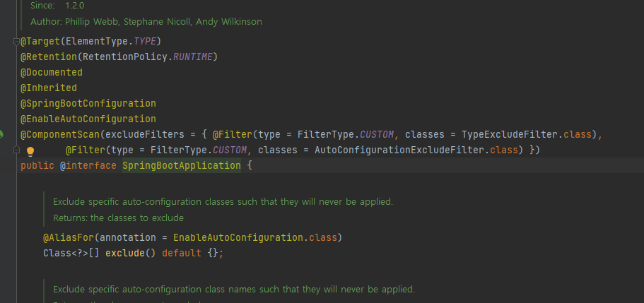 @SpringBootApplication 을 클릭하면 위처럼 필요한 어노테이션들이 선언되어있습니다.