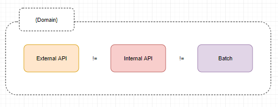 External API에는 필요하지만 Internal API에는 사용하지 않는내용이 들어가고 Batch에는 사용되지만 External APi, Internal API에는 사용되지 않는 내용들 말입니다.