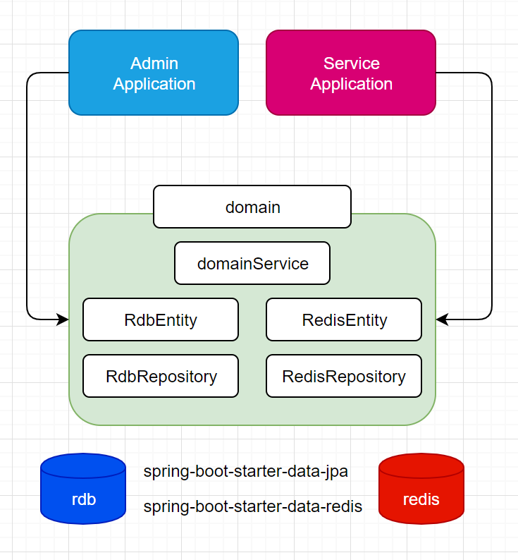 가장 많이 사용할수 있는 RDBMS 중심 도메인을 품고 있는 프로젝트는 아래와 같은 형태의 모듈이 만들어 집니다.