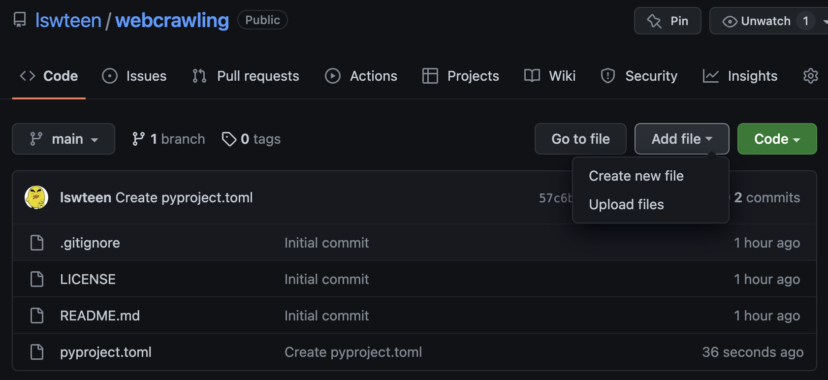 github > 프로젝트에 "pyproject.toml" 파일을 create new file 로 만든뒤에 아래처럼 내용을 넣어주고