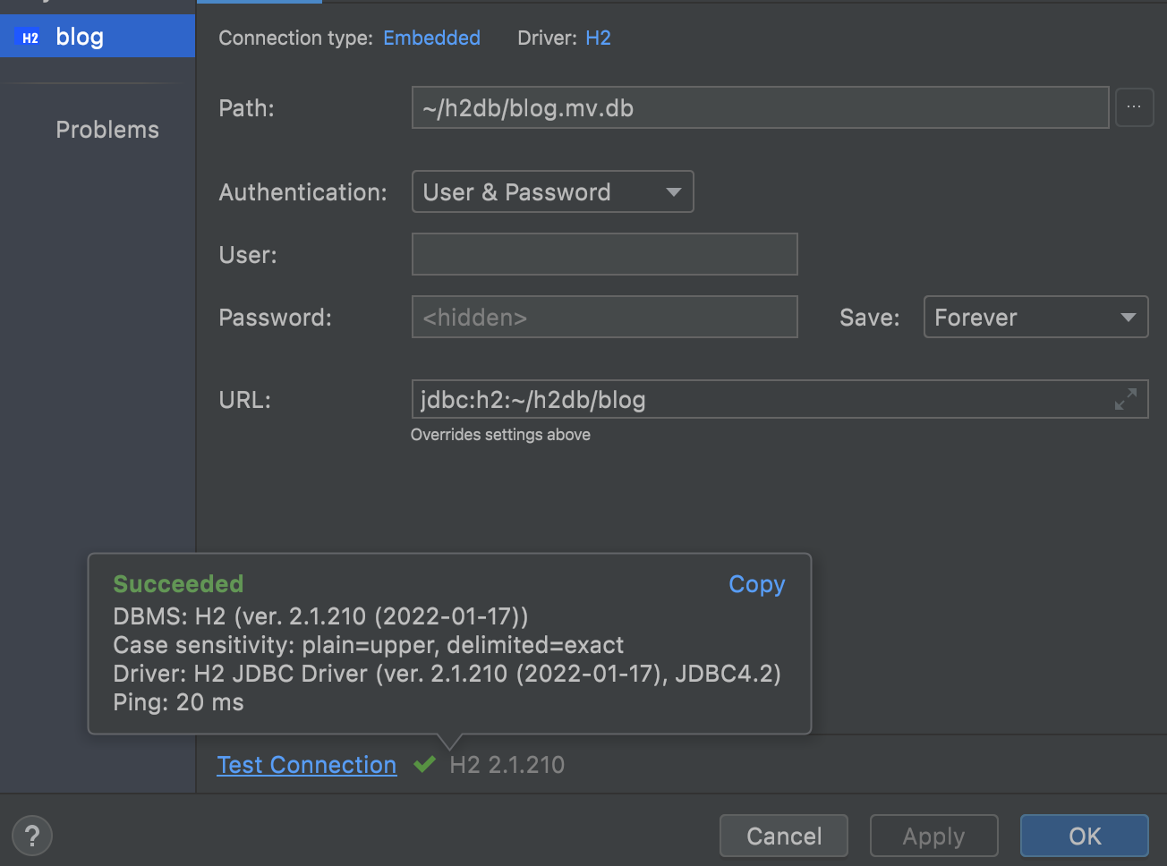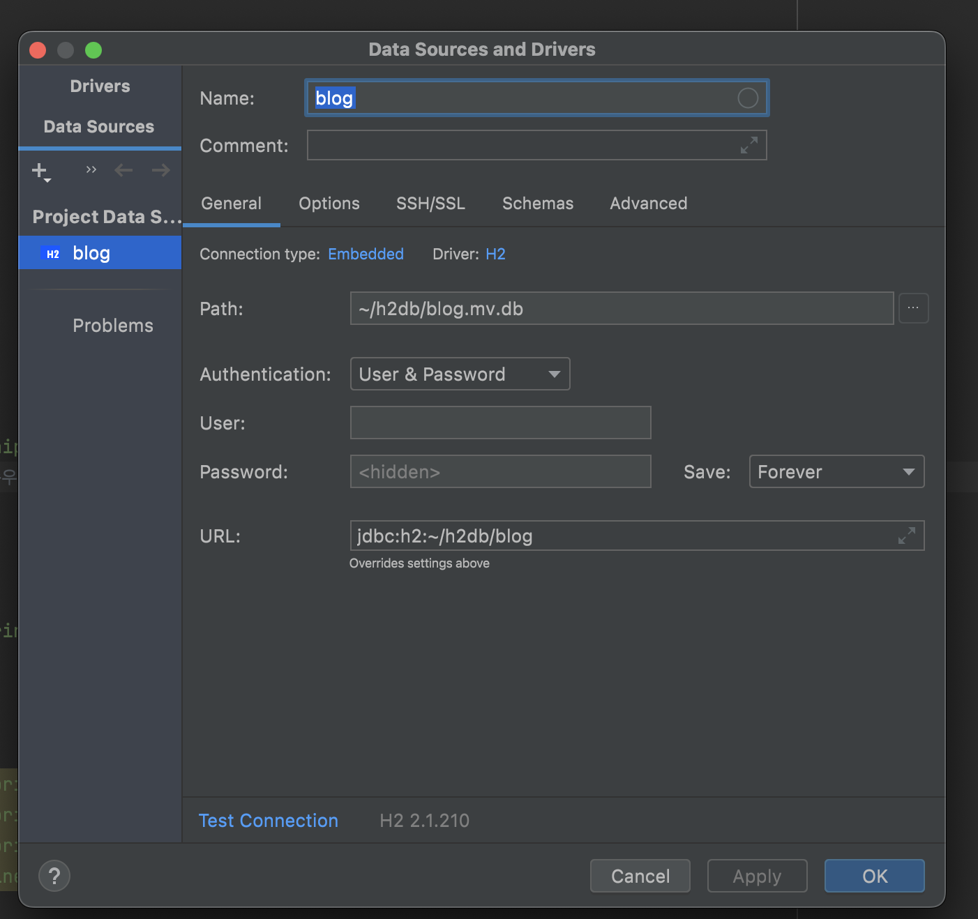 ~/h2db/blog.mv.db 해당경로에 파일은 blog.mv.db로 저장됩니다. ~/ 같은경우 mac에서는 최상위 Root 경로입니다.