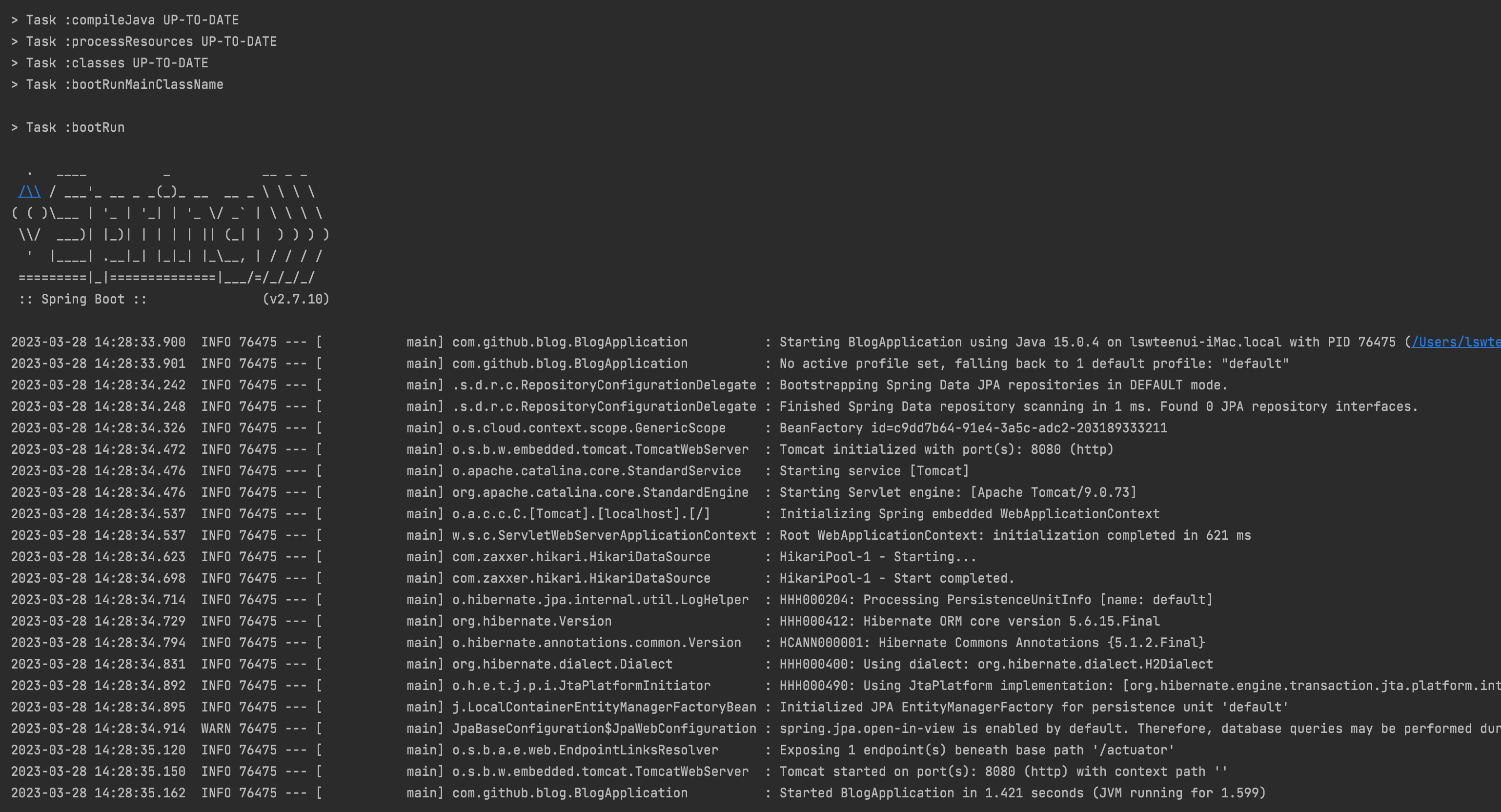 INFO 레벨로 표기된것처럼 8080 기본포트로 시작된 Springboot 정보확인이 가능합니다.