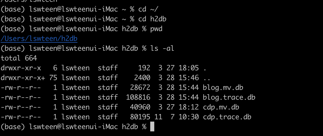 ~/h2db/blog.mv.db 해당경로에 파일은 blog.mv.db로 저장됩니다. ~/ 같은경우 mac에서는 최상위 Root 경로입니다.