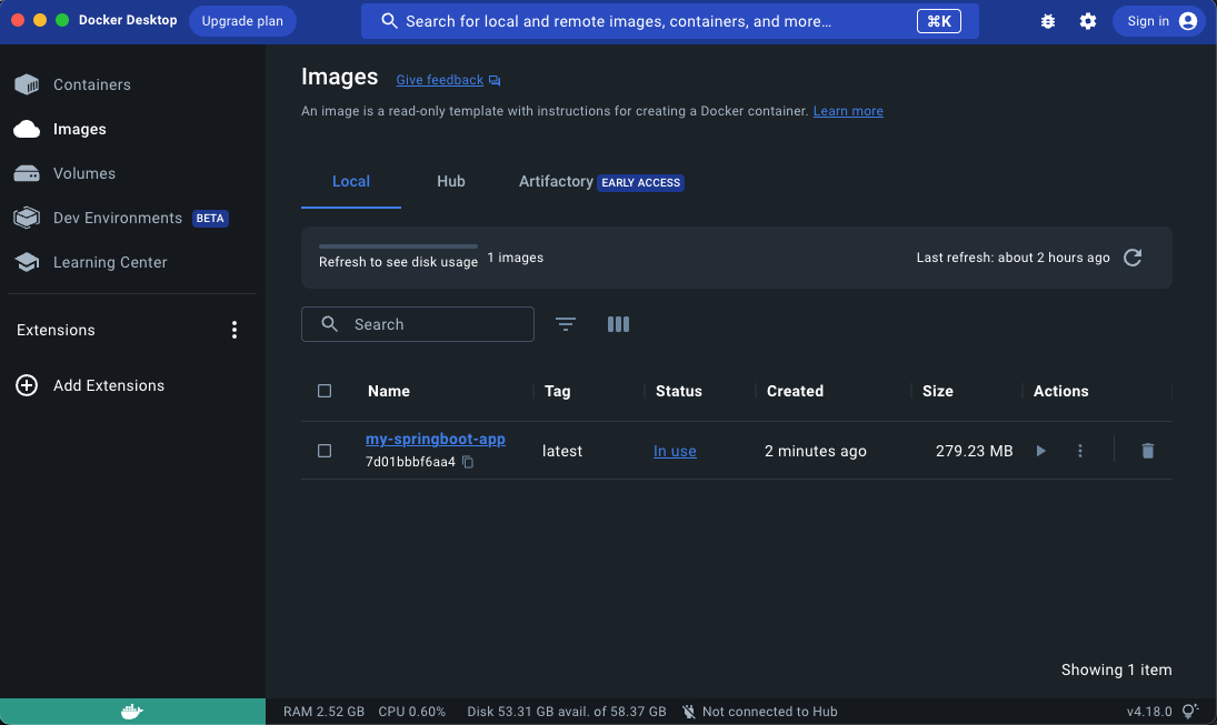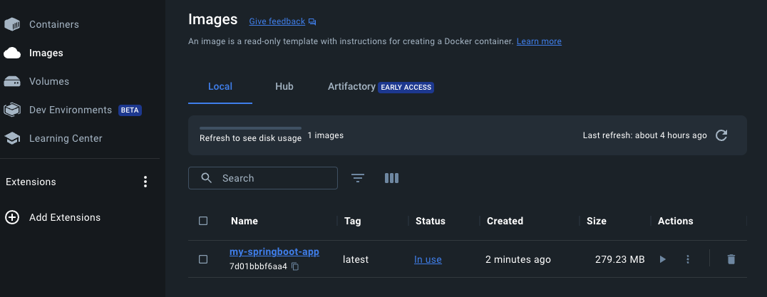 프로젝트 경로에서 위에 명령어 실행시 docker images dashboard 에서 확인 가능합니다.