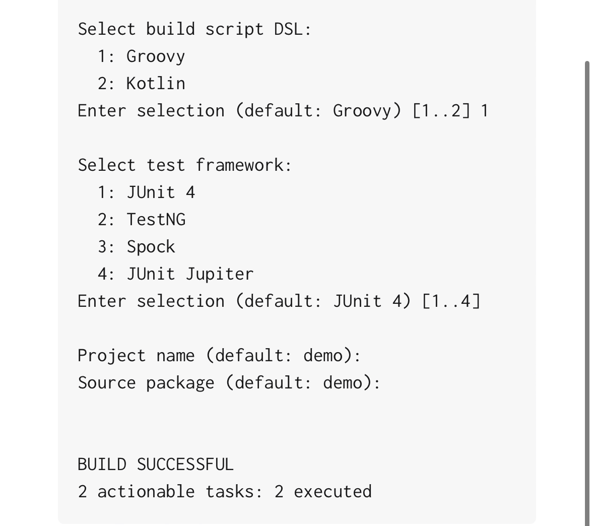 폴더 위치에서 터미널로 접근 후 위에서 알려준 명령어로 실행 후 선택하게 되면 Gradle Multi Module Project 구조가 생성됩니다