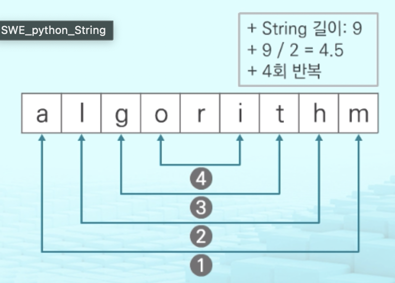 단어를 뒤집기 위해서 반으로 나누고 index들을 서로 바꿔주는 겁니다.