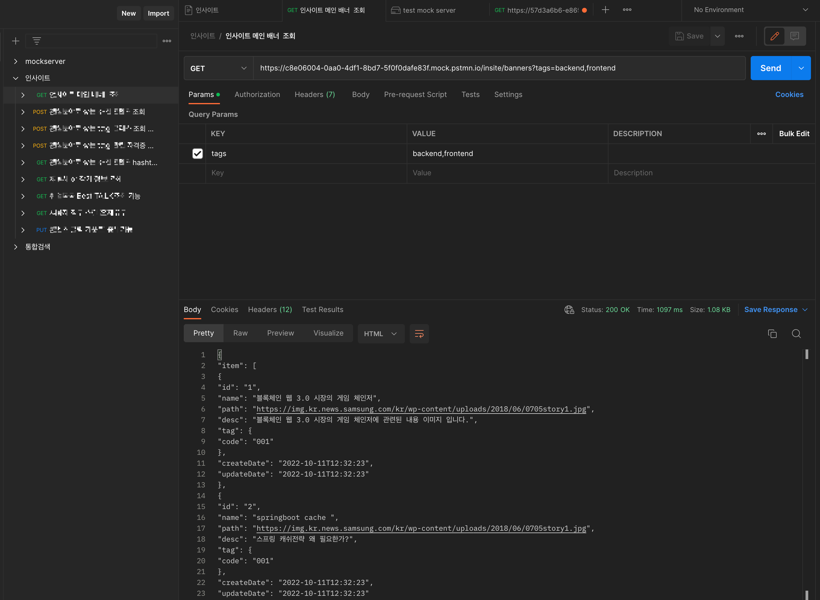 7. Collctions에 등록된 API를 직접 호출하면 정상적으로 Response 되는 Mock 데이터 확인이 가능합니다.