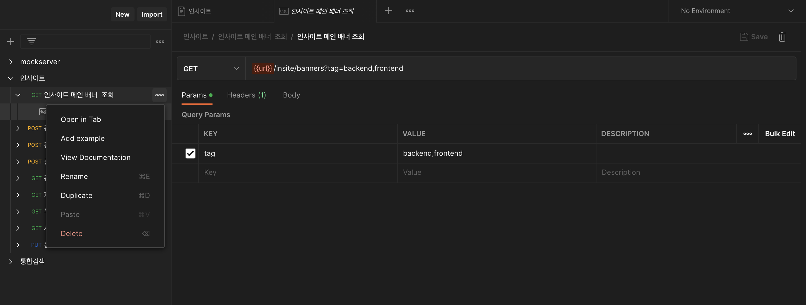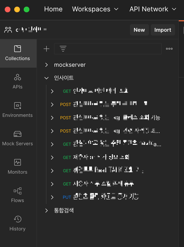 Postman 기능으로 생성하거나 import한 API항목을 볼수 있습니다.