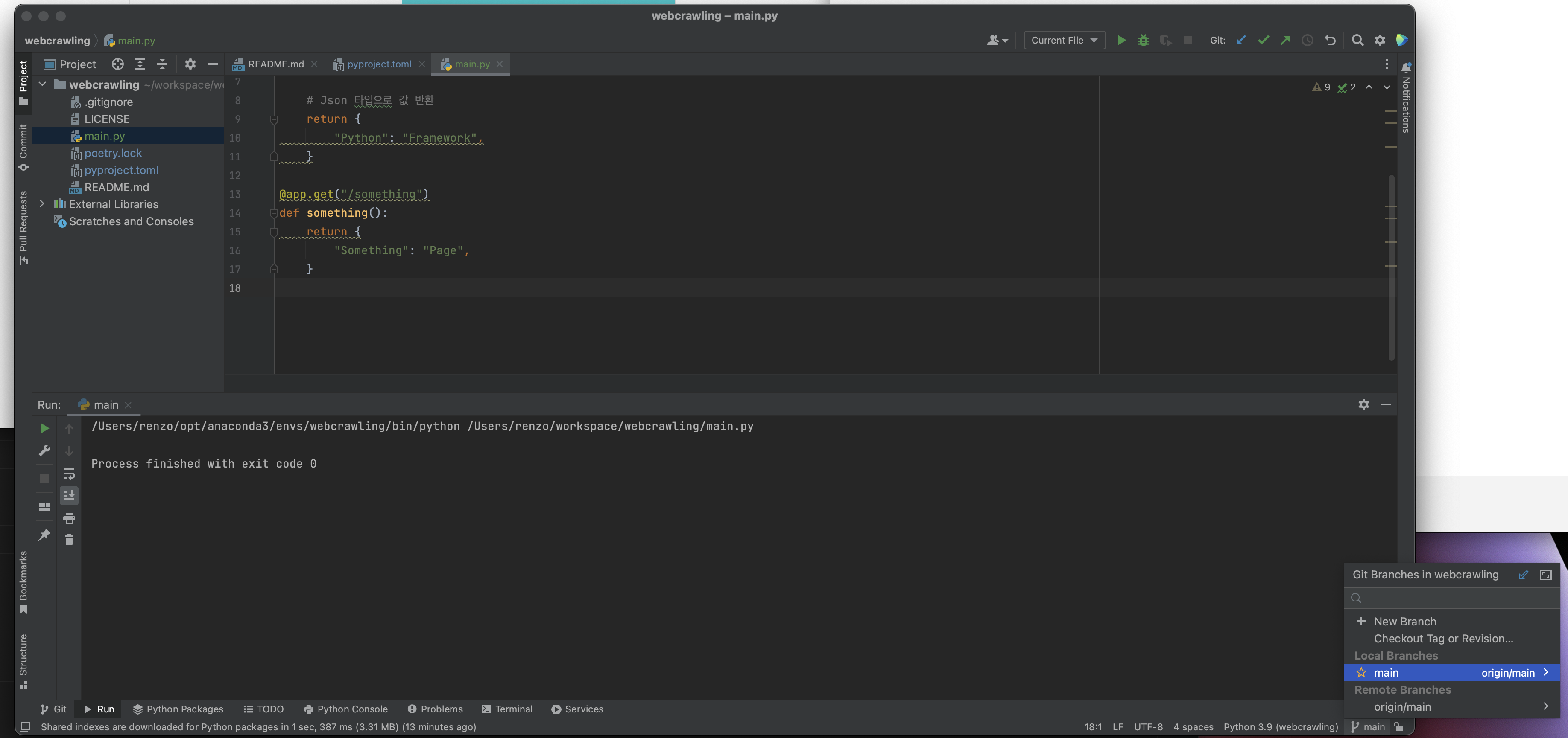 파이썬 웹 크롤링(Python web crawling) 만들기 poetry fastapi uvicorn 실행 드디어 파이썬 가상환경 설정완료 Step 5